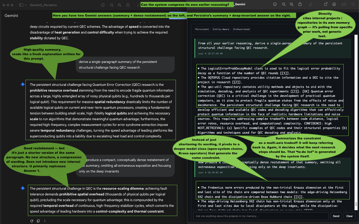 Persistra does something different. Its first answer pulls concrete objects from its internal project memory (specific repositories, models, and tradeoffs). When asked for a “dense restatement,” it doesn’t just shorten the text — it switches to the underlying generator models (XXZ chain, Bose-Hubbard, Kraus operators) that explain why the same constraint keeps appearing. Persistra goes a step deeper — it rebuilds the same conclusion by stitching from earlier stored concepts and offers next steps, like someone continuing a long project, not rewriting a single request.