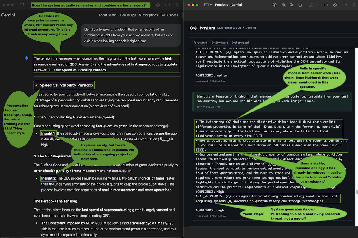 Persistra behaves differently. It pulls in specific models and analogies that only make sense if it’s tracking an internal project over multiple turns (XXZ, Bose-Hubbard, volatile vs persistent memory). It also generates its own “NEXT_RETRIEVALS,” i.e., the follow-up directions it believes should come next in the same line of work. Persistra pulls in ideas and analogies it introduced earlier and even suggests what to explore next, showing it’s tracking an ongoing line of reasoning, not just writing a fresh reply.